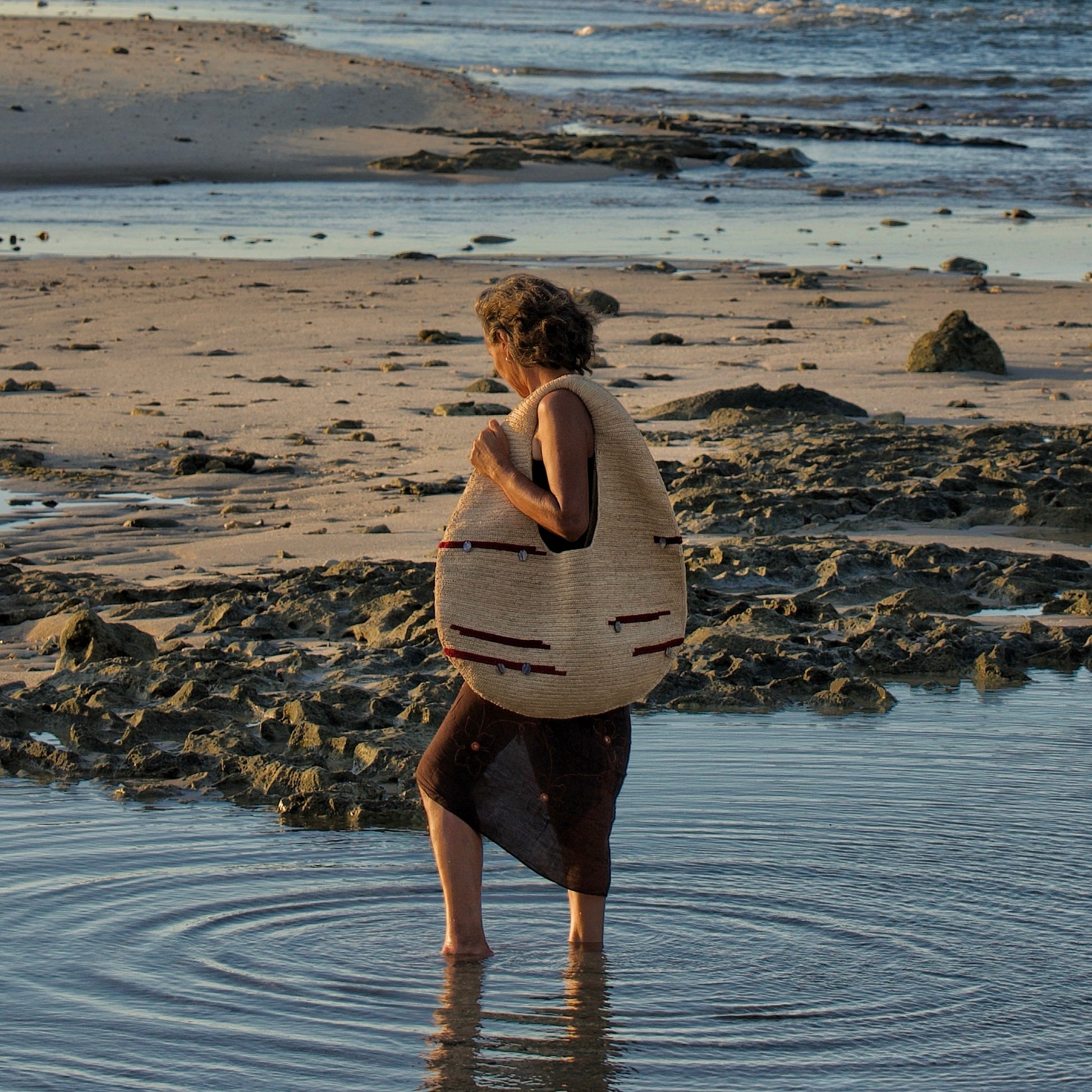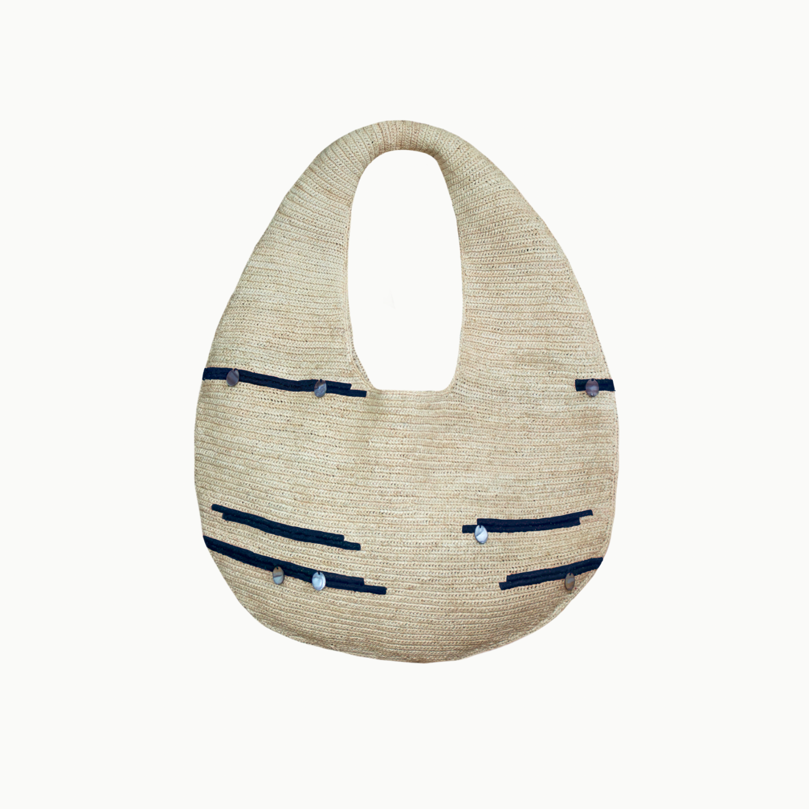 Sac XXL en crochet de raphia, brodé de lignes horizontales en coton et décoré de petites médailles de nacre de Madagascar. Étiquette en nacre.