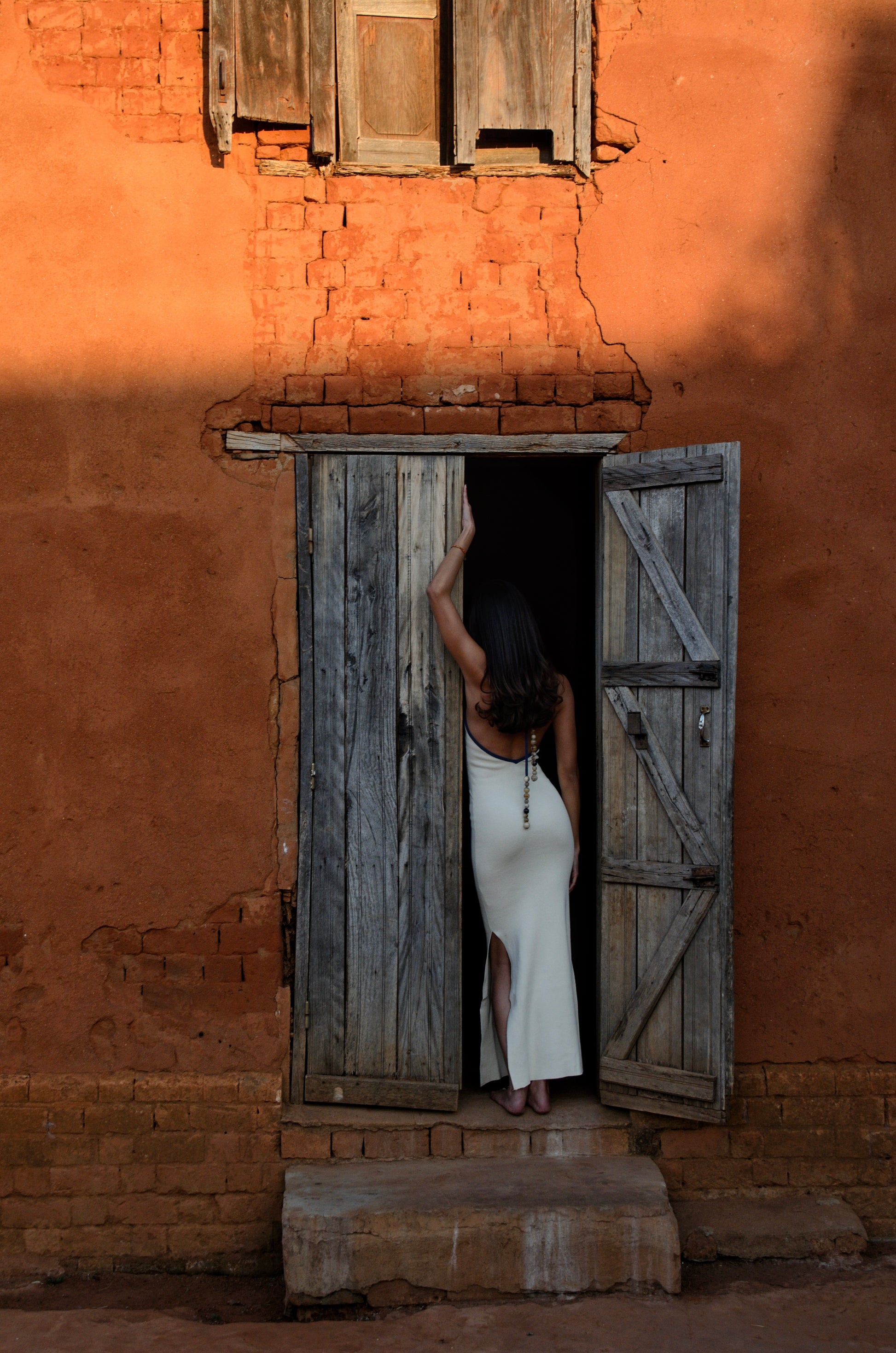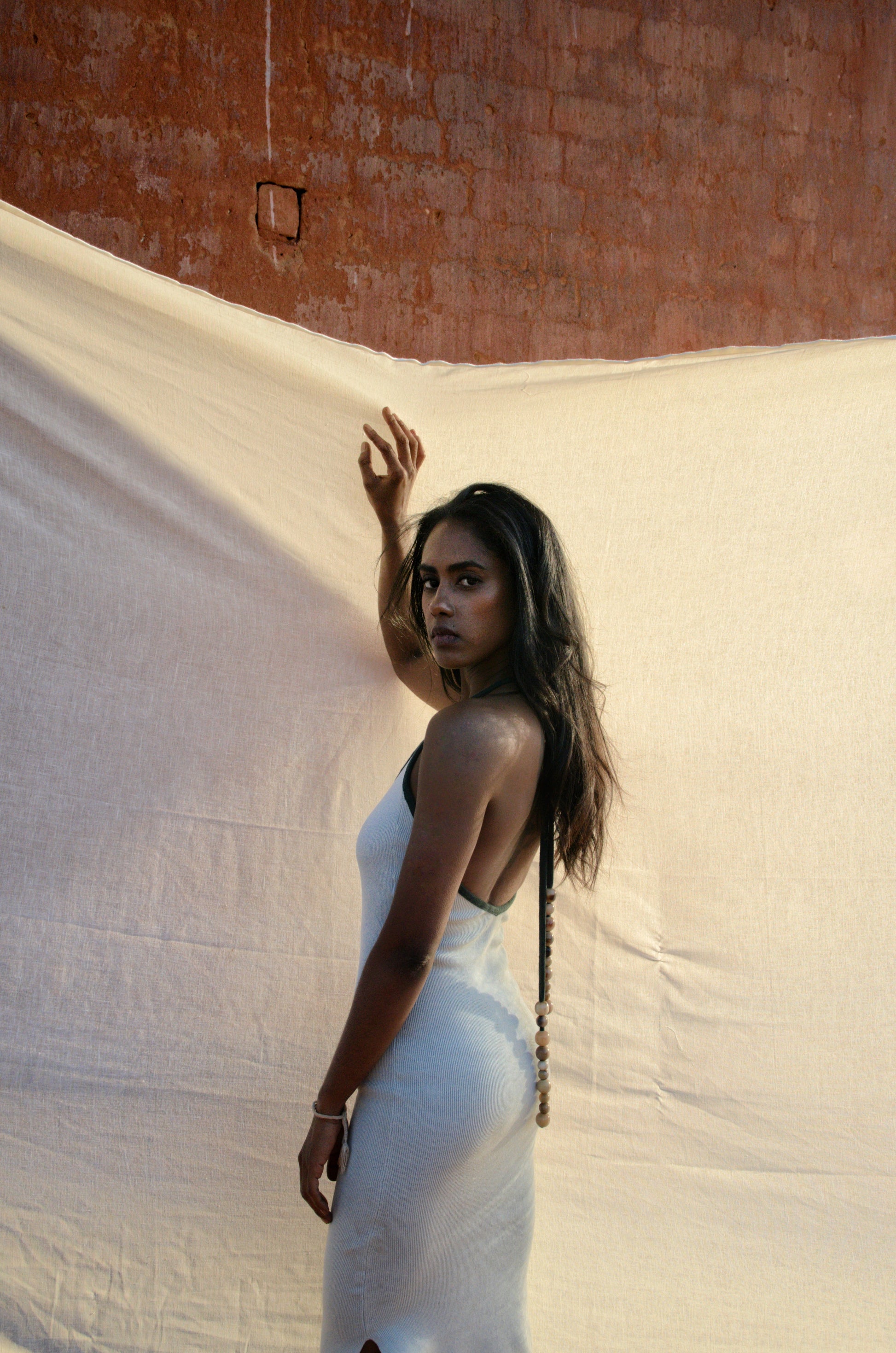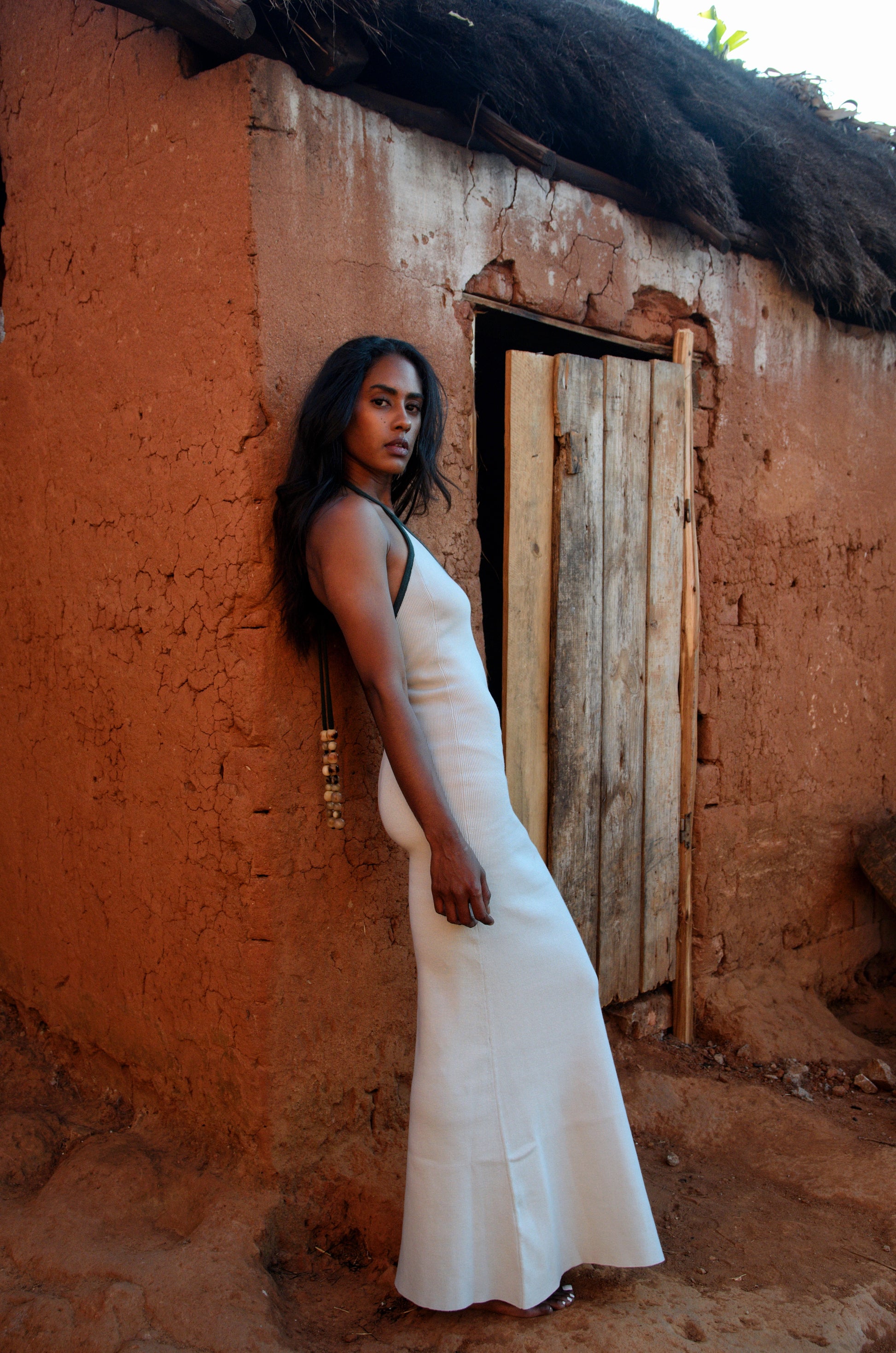 Robe longue en maille de coton, coupe moulante avec dos nu et fente sur le côté. Maintien parfait, ajustable grâce aux liens à nouer dans le cou — adaptée aux fortes poitrines.